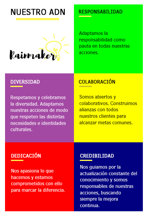 Los profesionales de Rainmaker orientamos nuestro trabajo desde la convicción que el modo de gestionar al talento en la organización representa un factor diferencial para el éxito de la misma.